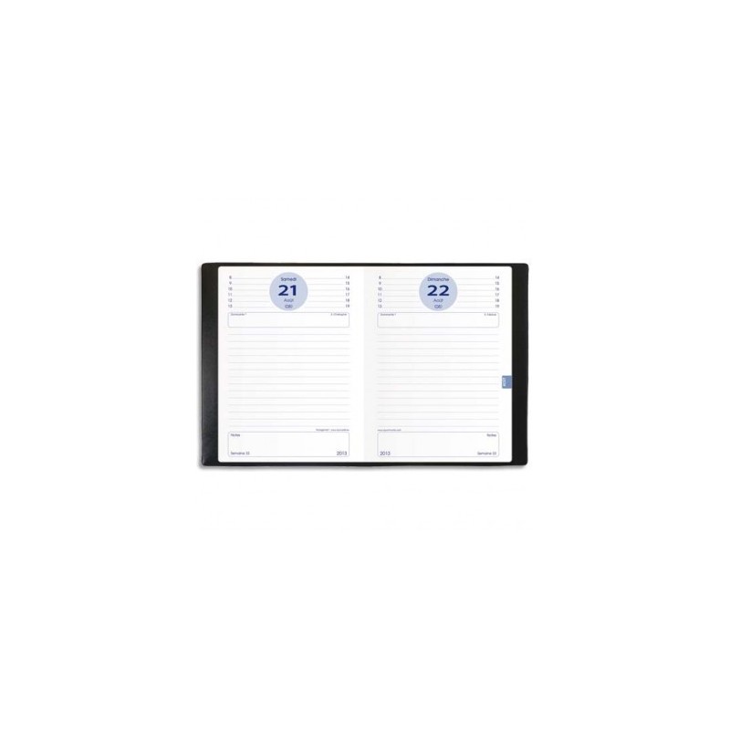 Format 12 x 17 cm. 12 mois de septembre à août. 1 jour par page. Couverture plastique grainée noire. Textagenda.