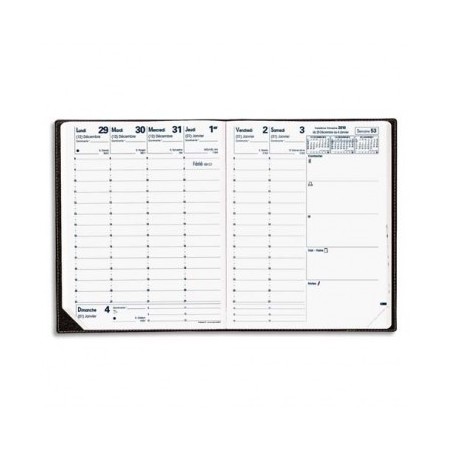 1 semaine sur 2 pages. Décembre à décembre : 13 mois. Couverture plastique grainée noire. Semainier Quo Vadis mi-novembre à décembre