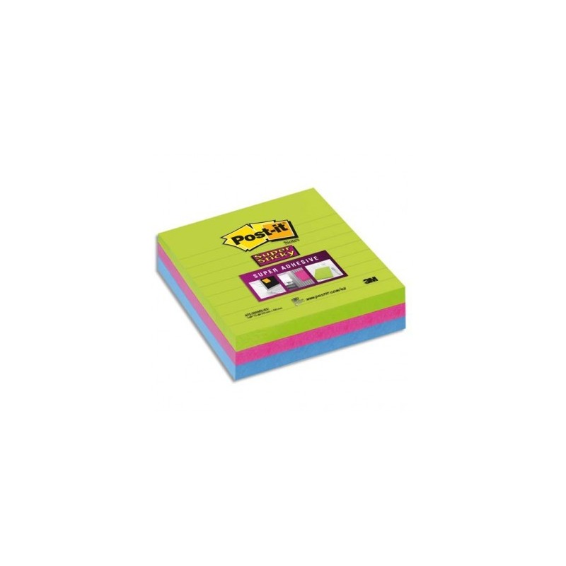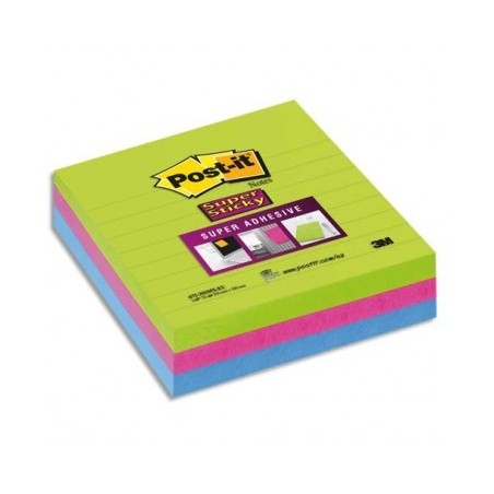 POST-IT Lot 3 blocs de 70 feuilles Sticky ligné 10 x 10cm. Coloris néon citron vert, fuschia, turquoise